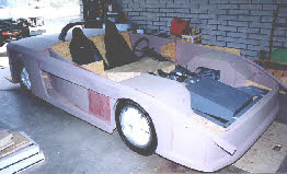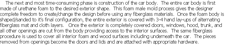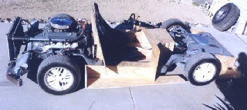 Building the chassis and drive train was fairly straight-forward and parts were assembled in original configuration wherever possible. Two major changes were putting the radiator in back and the gas tank in front. Once the engine/transaxle and suspension was installed, the body foundation was designed to fit the frame and provide the driver/passenger compartment. This foundation was fabricated from plywood and provides the floor, firewalls, dash-board, inner door panels, front and back bumper/light mounts, and mounts to the chassis. At this phase the project looked like a giant go-kart and with some temporary controls, wiring, and plumbing was driveable.